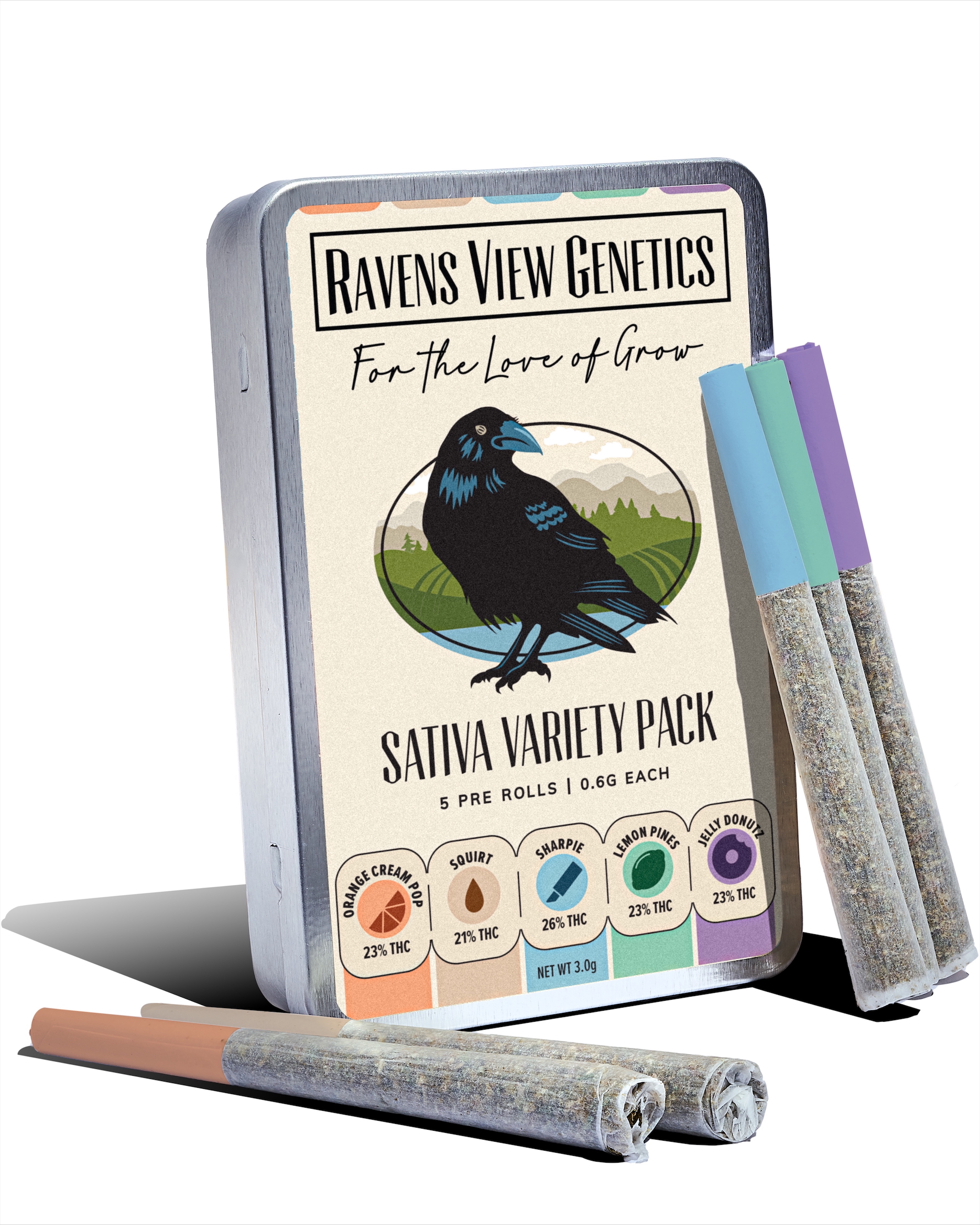 With five different sativa strains to explore, the RVG Sativa Variety Pack empowers sativa lovers with an assortment of premium-quality options: Orange Cream Pop, Squirt, Sharpie, Lemon Pines, and Jelly Donutz. Discover five different sativa pre-rolls, all single-source and bursting with flavor from the Ravens View Genetics farm.